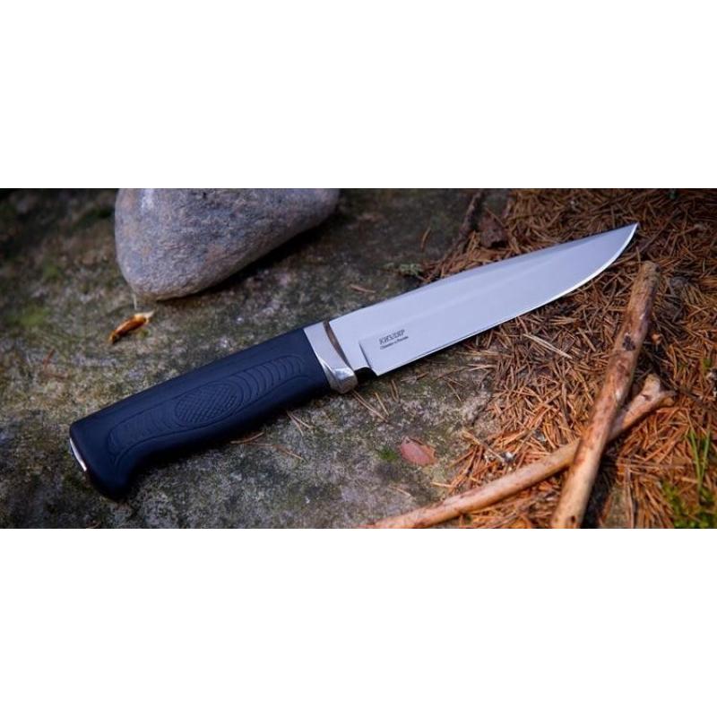 Французская сталь высокого качества, эластрон на рефлённой рукоятке (резинопластик ELASTRON G, используемый для рукоятей кизлярских ножей, прочный как вулканизированный каучук, остается гибким при температурах от -65° до 150°C), пожизненная гарантия качества ( при условии целевого использования ).